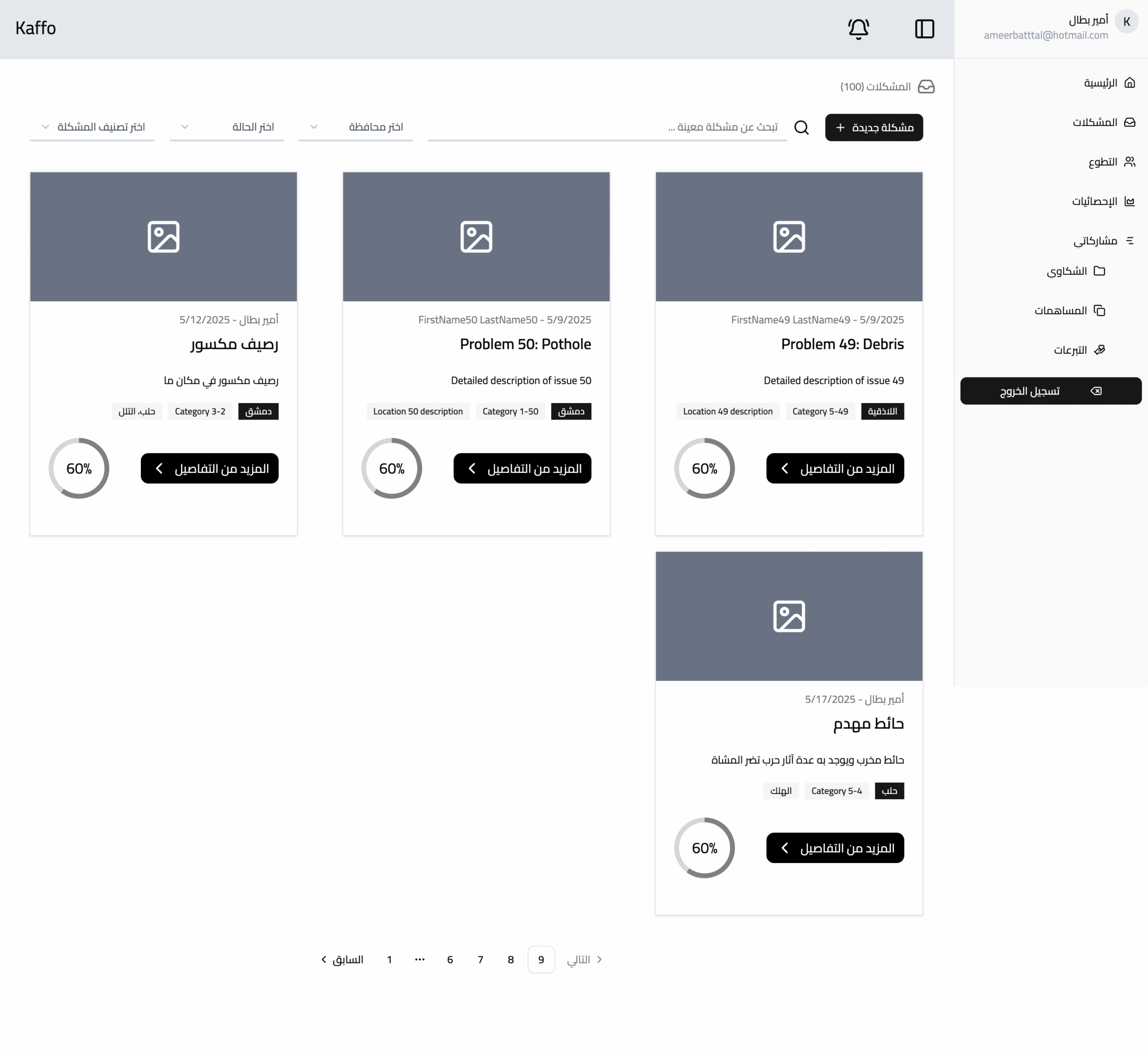 قسم الجهة المعنية، يصل لها كل الشكاوي المرتبطة بالتصنيفات الخاصة بها عند تحديد ذلك من قبل المستخدم العادي، تستطيع أن ترى كافة الشكاوي وهي المسؤولة عن عملية حل الشكوى، يوجد عدة حالات لحل الشكوى، الجهة المعنية تتكفل بالحل والتكلفة، الجهة المعنية تفوض الشكوى لطرح المساهمات وهي تتكفل بالتكلفة، الجهة المعنية تقترح الحل وتفوض التكلفة للتبرع، الجهة المعنية تفوض الشكوى لطرح المساهمات وتفوض تكلفة المساهمة المختارة للتبرع، بعد اختيار الحالة المناسبة، تقوم بتعيين ممثل عنها ليقوم بالتواصل مع المواطن الذي قدم المساهمة لإتمام ومتابعة حل الشكوى وتوثيق مراحل الحل، الجهة المعنية تستطيع طرح مناقصات بشكل مشابه للشكوى التي يقوم المستخدم بطرحها وهذه المناقصة تخضع للحالات السابقة أيضاً.