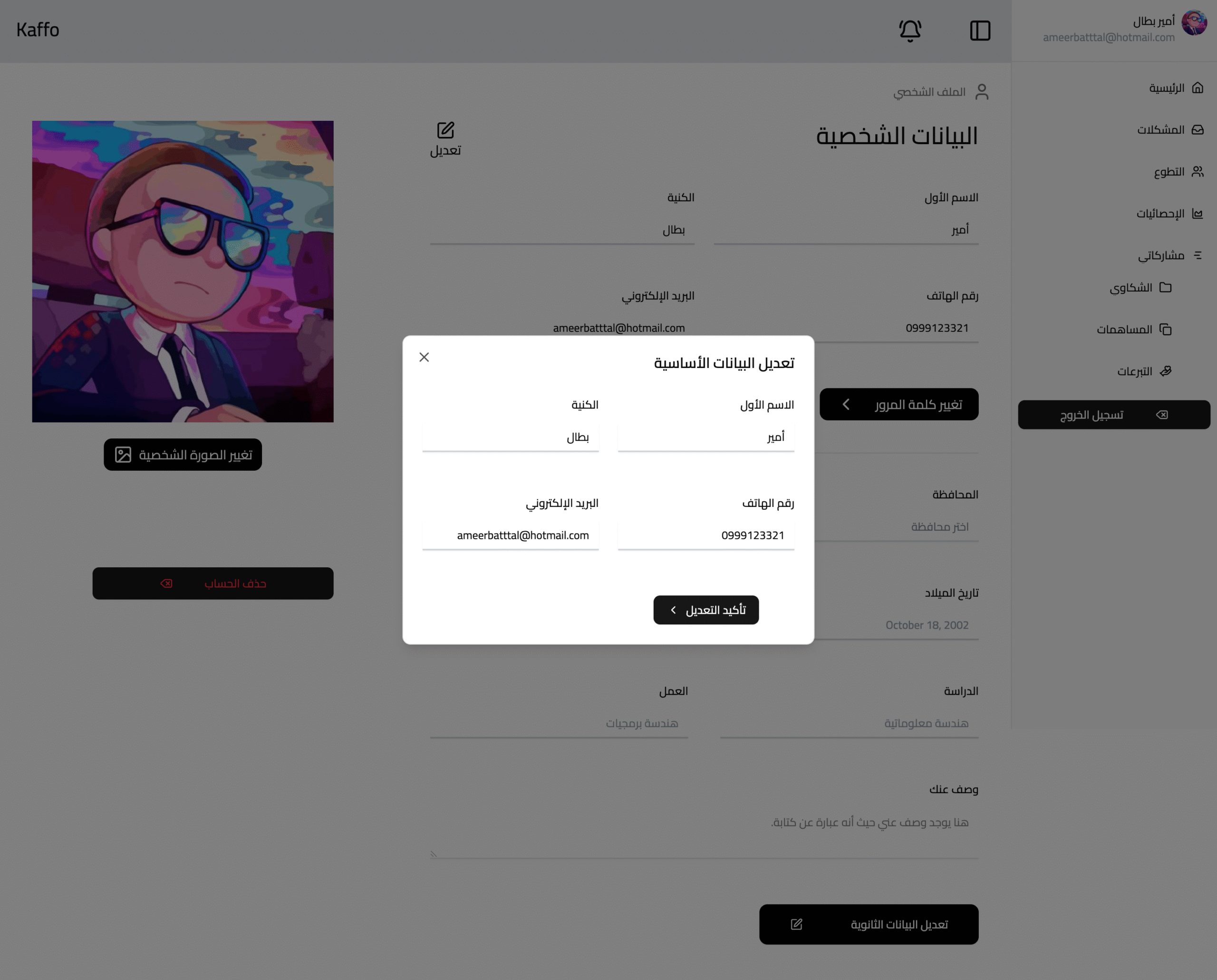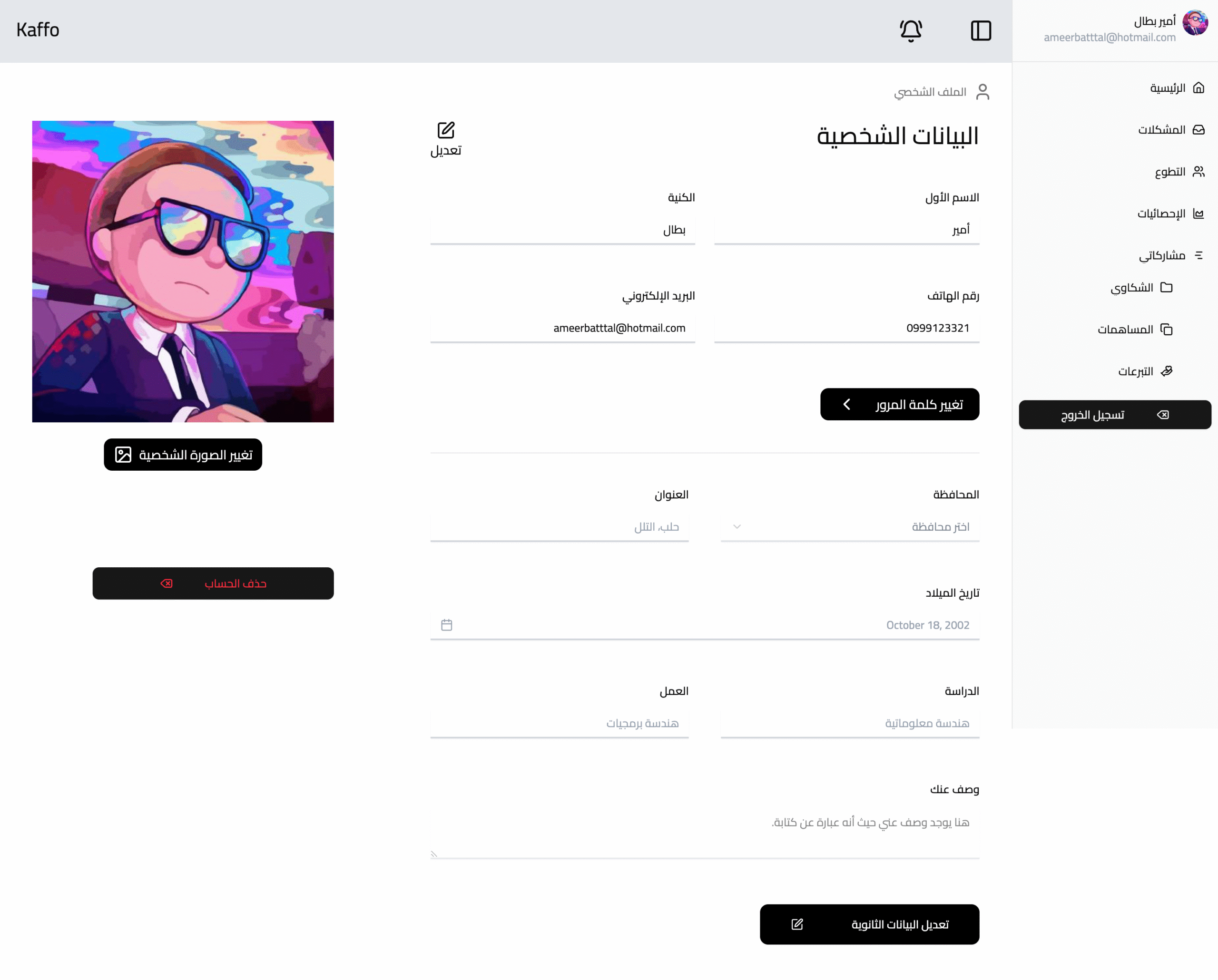بالنسبة لقسم المستخدم العادي، يستطيع رفع الشكوى الخاصة به بعد إكمال حسابه الشخصي، ويستطيع مشاهدة كل الشكاوي التي رفعها ومتابعة تقدمها، ويستطيع المساهمة في حل الشكاوي الآخرى التي قامت الجهة المعنية بتفويضها للتطوع من خلال كتابة المساهمة والتكلفة المتوقعة للحل، ويستطيع أيضاً التبرع لحل الشكاوي في حال قامت الجهة المعنية بتفويض ذلك.